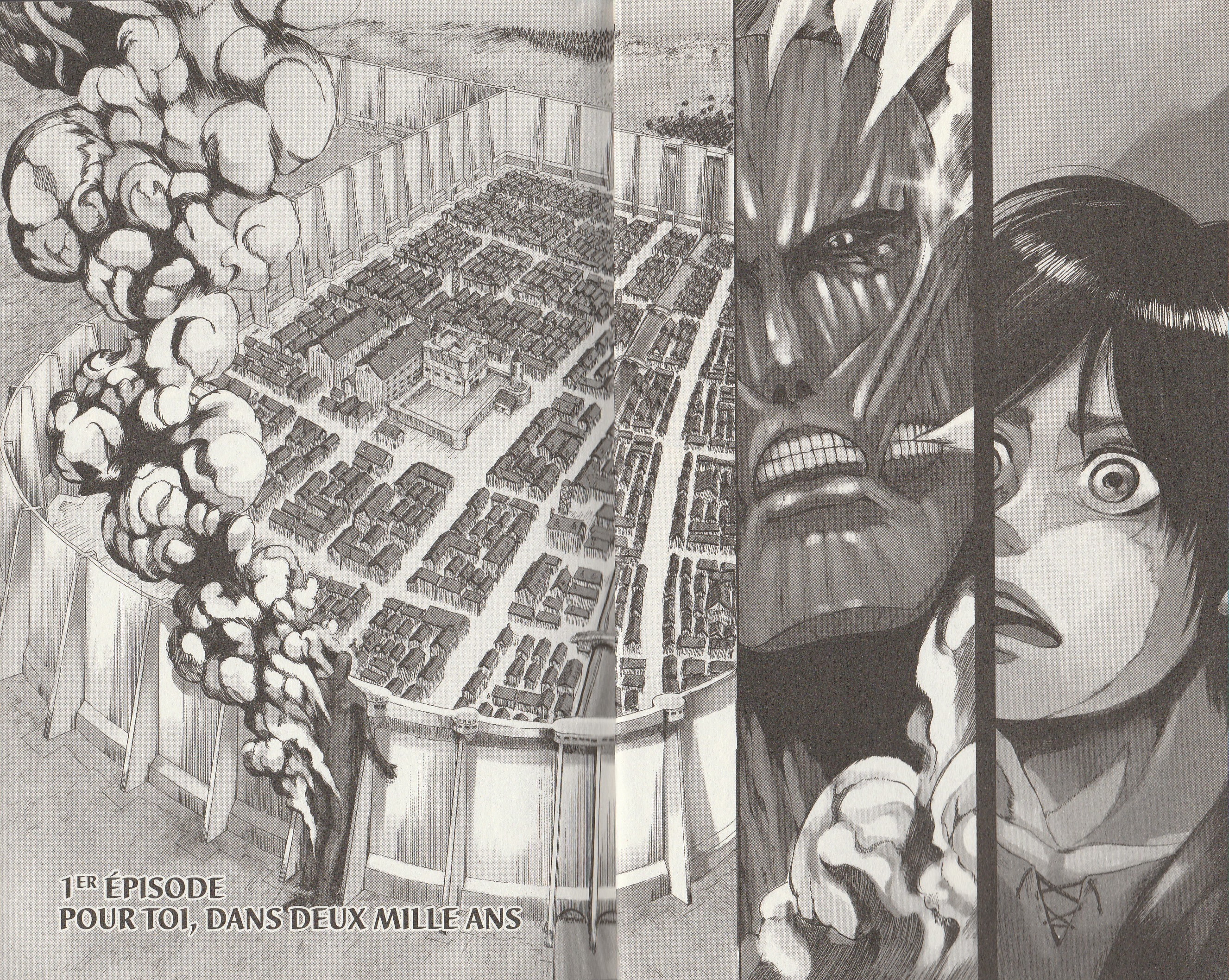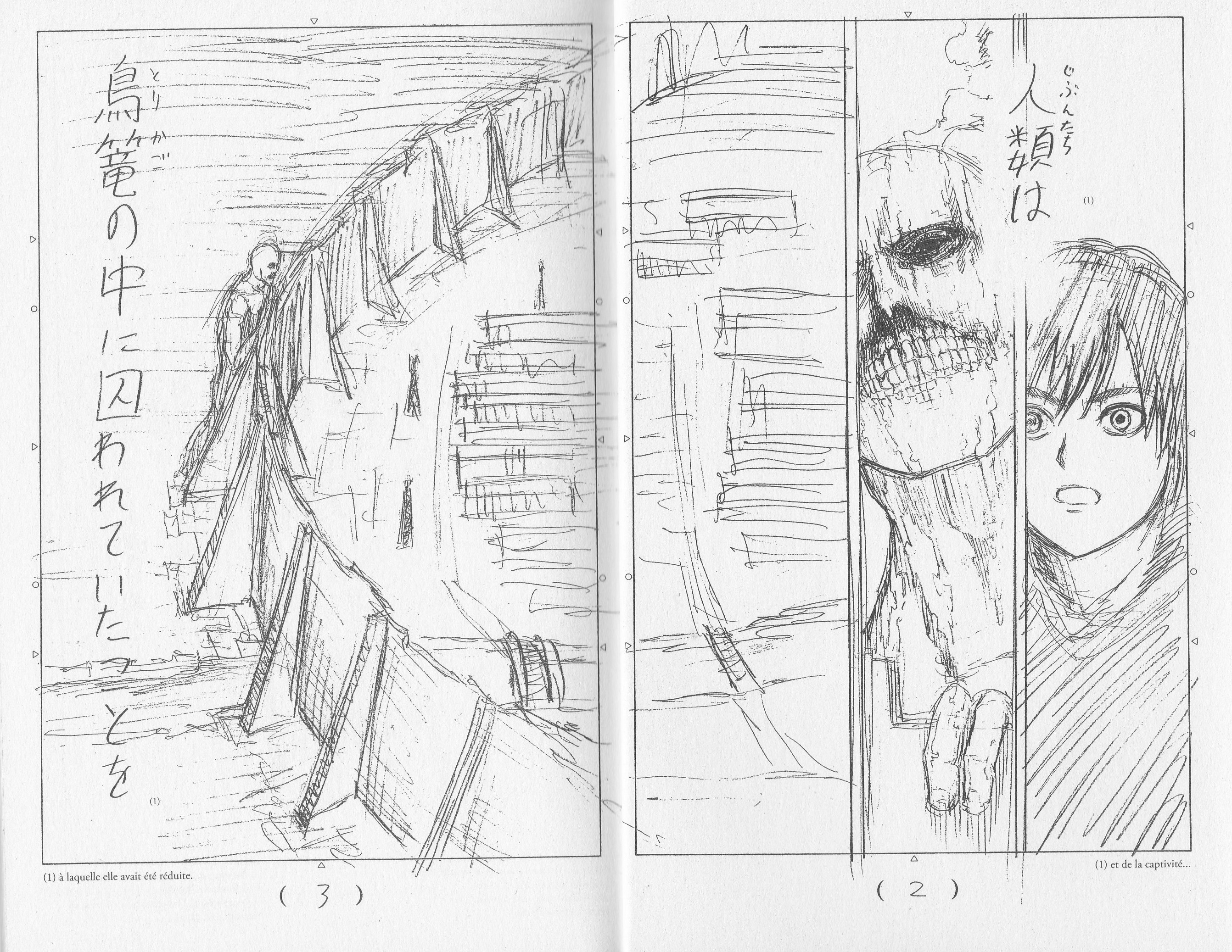 « Découvrez les storyboards des deux épisodes pilotes de la série tels qu’ils ont été soumis au comité de lecture du Bessatsu Shônen Magazine lors de sa création, en 2009. Bien qu’ils aient été approuvés pour publication, Hajime Isayama a finalement souhaité les réécrire, si bien que ce premier jet est resté inédit. »