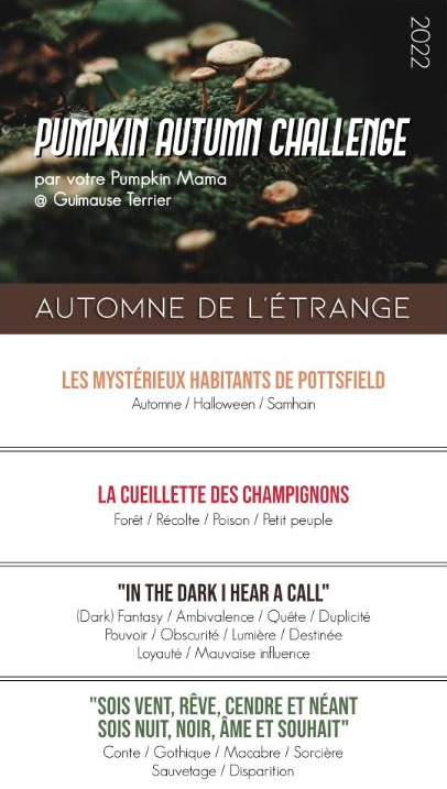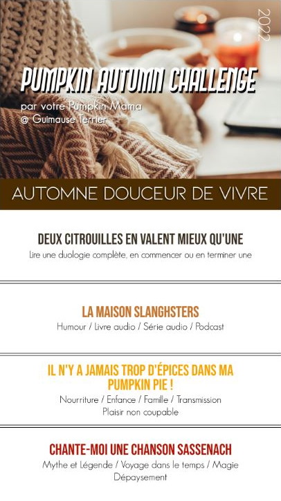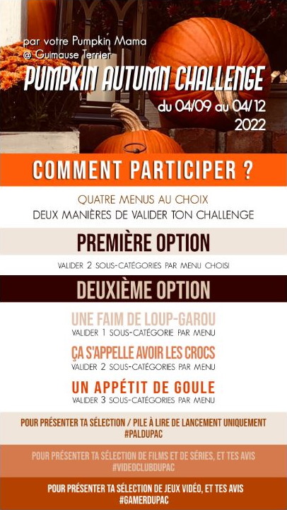 Le Pumpkin Autumn Challenge ou PAC est un défi littéraire, cinéphile et jeux vidéo qui se déroule pour une sixième année! Ce défi a été créé par Guimause Terrier.