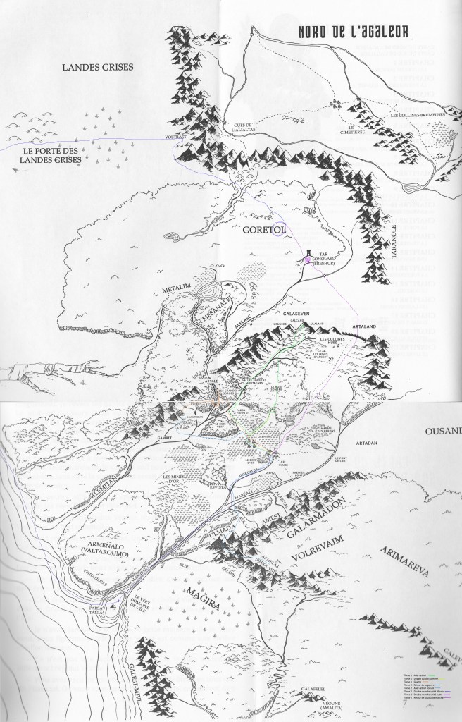 Par ailleurs, tout comme dans le tome un, deux grandes cartes sont présentes au début du livre pour nous aider à suivre les pérégrinations d’Abrano. Voici les cartes fusionnées.