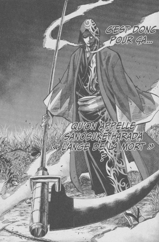 La faux de guerre n’a pas l’apparence intéressante de la faux de la Grande Faucheuse, mais elle en rassemble les avantages. Grande portée, elle permet d’accrocher, de percer, de couper, etc. Toutes des utilisations effectuées par Sanosuke Harada. Je suppose que Harada (historique ) manipulait une naginata (un katana avec un long manche). La longueur des naginata varie entre 205 et 260 cm de long soit une longueur correspondant à l’arme vue dans le manga.