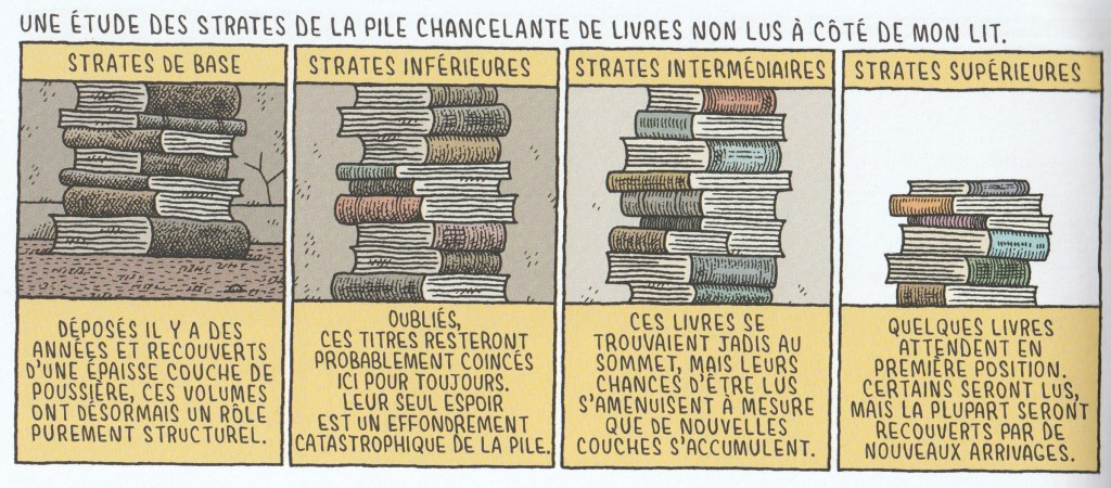 Pour ma part, j’ai trouvé qu’une illustration ou une bande (strip) me faisait rire chaque 4 à 5 pages. De plus, les histoires les plus amusantes à mon goût furent celles qui relatent une situation propre aux férus de lecture.