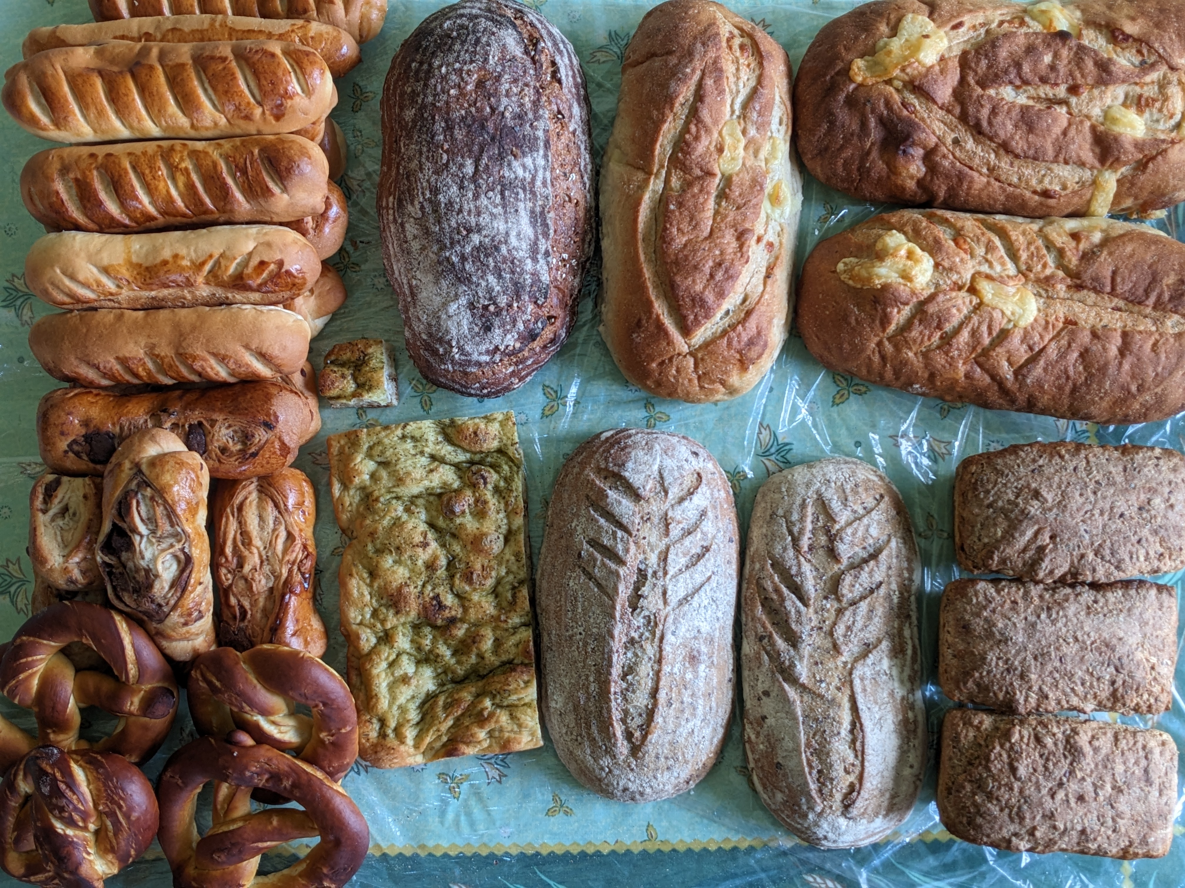La semaine dernière a été une nouvelle fois fort occupée. Entretien du levain, découverte de recettes pour passer des rafraichis de levain, visite d’amis et deux autres soirs de formation sur la fabrication artisanale du pain au levain. Ai-je déjà mentionné la durée de ces soirées? Officiellement, le cours est de 18 h à 21 h 30, mais on commence souvent vers 17 h 30 et nous terminons vers 22 h ou 22 h 30. Au terme de chacune des soirées, nous repartions avec notre production : pain viennois nature ou chocolat (ça ressemble à de la brioche), rugbrod (pain danois), pâtes à pizza, pains aux grains (quinoa germé et sarrasin grillé), pains aux fromages et focaccia. Notre devoir et défi est de préserver, entretenir et utiliser notre levain en vue de cuisiner nos pains avec notre levain.
