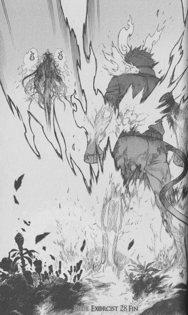 Après la prise de contrôle de la forteresse d’Illuminati, de son atterrissage en catastrophe, de l’apparition du père des jumeaux (Rin et Yukio) et de son armée dans le tome 27, l’intrigue et surtout les combats se poursuivent.