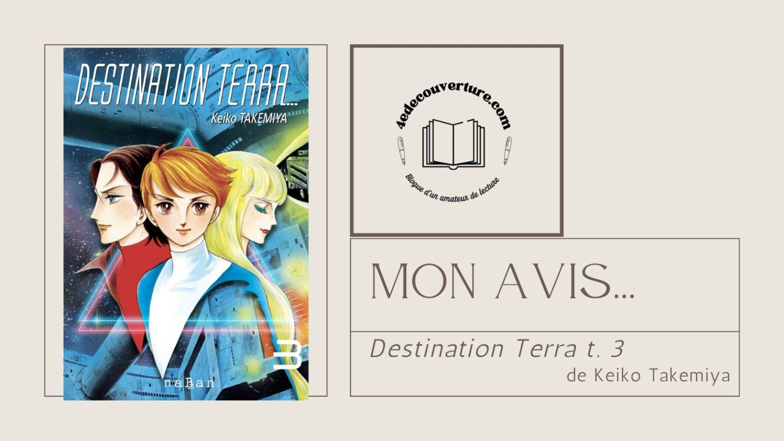 TAKEMIYA, Keiko. Destination Terra : t. 3. Paris : naBan, 2022. Shonen, 3 tomes. Chers lecteurs et chères lectrices, Aujourd’hui, je vous présente mon avis sur le troisième et dernier tome du manga Destination Terra de Keiko Takemiya publié aux éditions naBan que j’ai lu dans les dernières semaines. Publié le 25 février 2022, ilLire la suite « Mon avis… . Destination Terra : t. 3 »