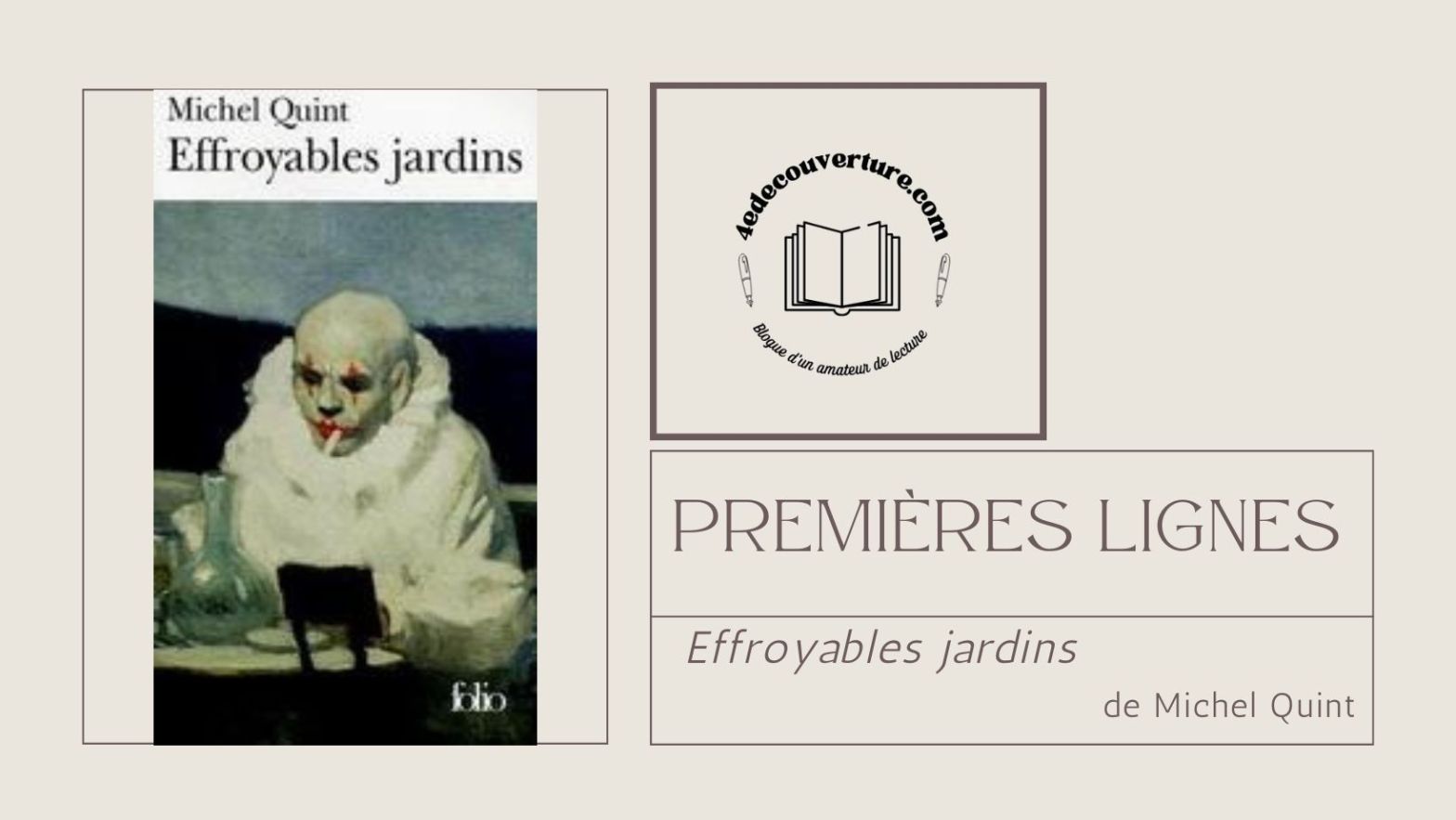 Chères lecteurs et lectrices aimant la lecture, Cette semaine, j’ai commencé le roman Effroyables jardins de Michel Quint publié par Folio. Le rendez-vous hebdomadaire Premières lignes a été créé par Ma lecturothèque et il vise à faire découvrir un livre au travers de ses premières lignes. Je vise à vous faire découvrir mes nouvelles lectures au traversLire la suite « Premières lignes : Effroyables jardins »